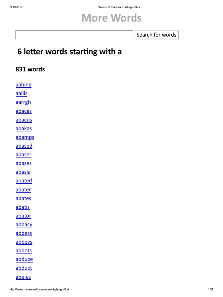 Acorns, assays, allies, and axioms. 6 letter words that start with a · aahing · aaliis · abacas · abacus · abamps · abased · abaser · abases . Find famous film titles, phrases and more! Here are a couple of ways you can get yo. Add length, consonants, vowels, syllables, origin, spelling and more.